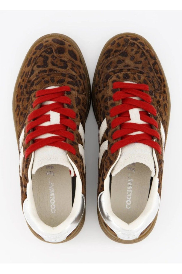 Diseñada en una silueta low-top de inspiración retro, destaca por su upper efecto gamuza con print leopardo en tonos chocolate y negro, una textura rica que eleva cualquier look casual. Las bandas laterales blancas aportan contraste limpio y equilibrio visual, mientras que los cordones rojos introducen un guiño audaz y contemporáneo.